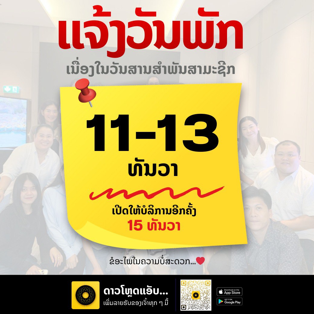 ເປີດໃຫ້ບໍລິການອີກຄັ້ງ 15 ທັນວາສົນໃຈສອບຖາມ ຫຼື ຂໍສິນເຊື່ອຜ່ານແອັບໄດ້.ທີມງານຂອງພວກເຮົາຈະຕິດຕໍ່ຫາທ່ານທັນທີທີ່ພວກເຮົາເປີດໃຫ້ບໍລິການຂໍອະໄພໃນຄວາມບໍ່ສະດວກ.
